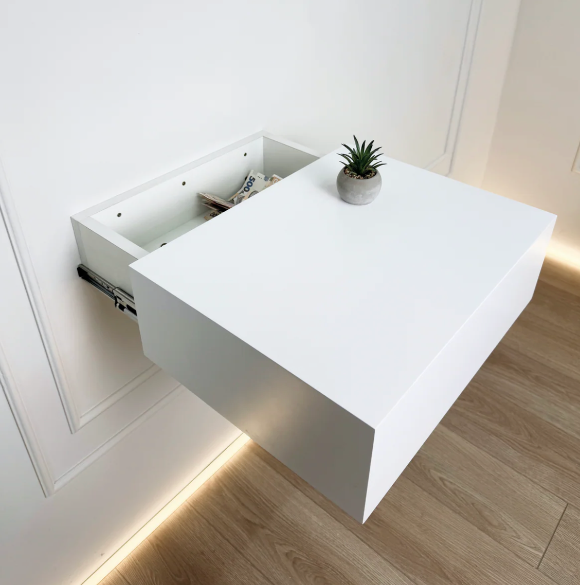 Notre gamme PHANTOM™ a l’apparence et la fonction d’un meuble classique, mais cache un compartiment de rangement secret — idéal pour préserver la confidentialité de vos effets personnels, sans attirer l’attention.